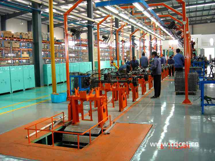 板链流水线,车桥流水线以标准顶板链为承载面,由马达减速机为动力传动,运行在专用导轨中,根据工艺流程不同,顶板链分为转弯及直线型。