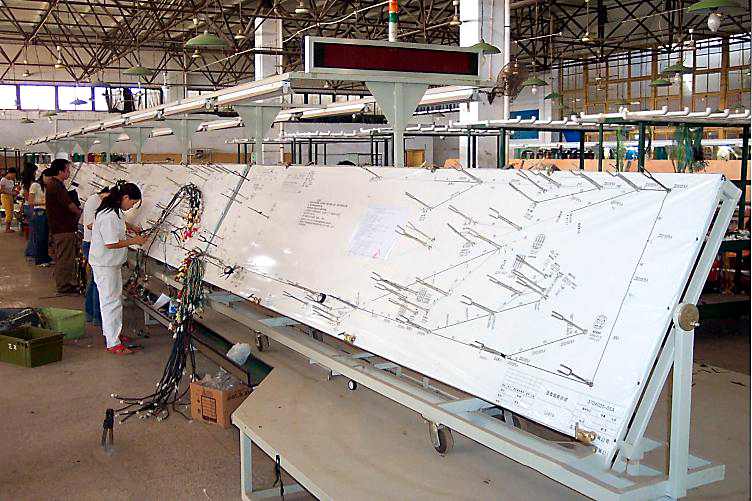 使用WPO-100型减速机调试链条的张紧度。变频器采用国内知名日虹品牌三厢2.2KW功率变频器。   电子线束生产流水线设备顶部有照明系统,前后有急停开关共4只、警报开关4只,工艺文件架,每工位2套。